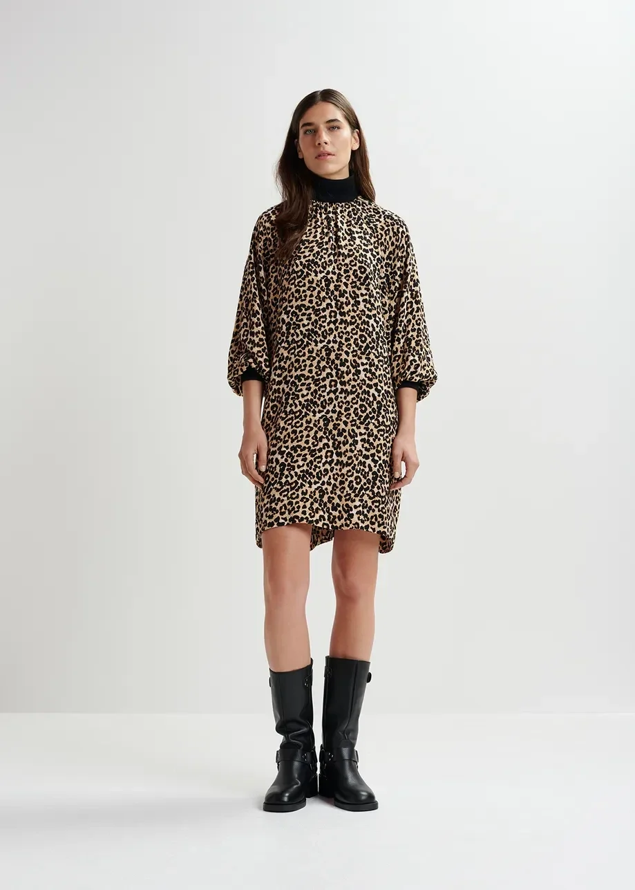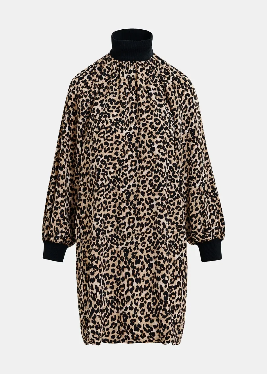 Mini-jurk vervaardigd van losvallende viscose, beprint met een opvallend motief. De relaxte pasvorm is netjes omlijnd door een ribgebreide opstaande kraag en manchetten voor een gesofisticeerde uitstraling.