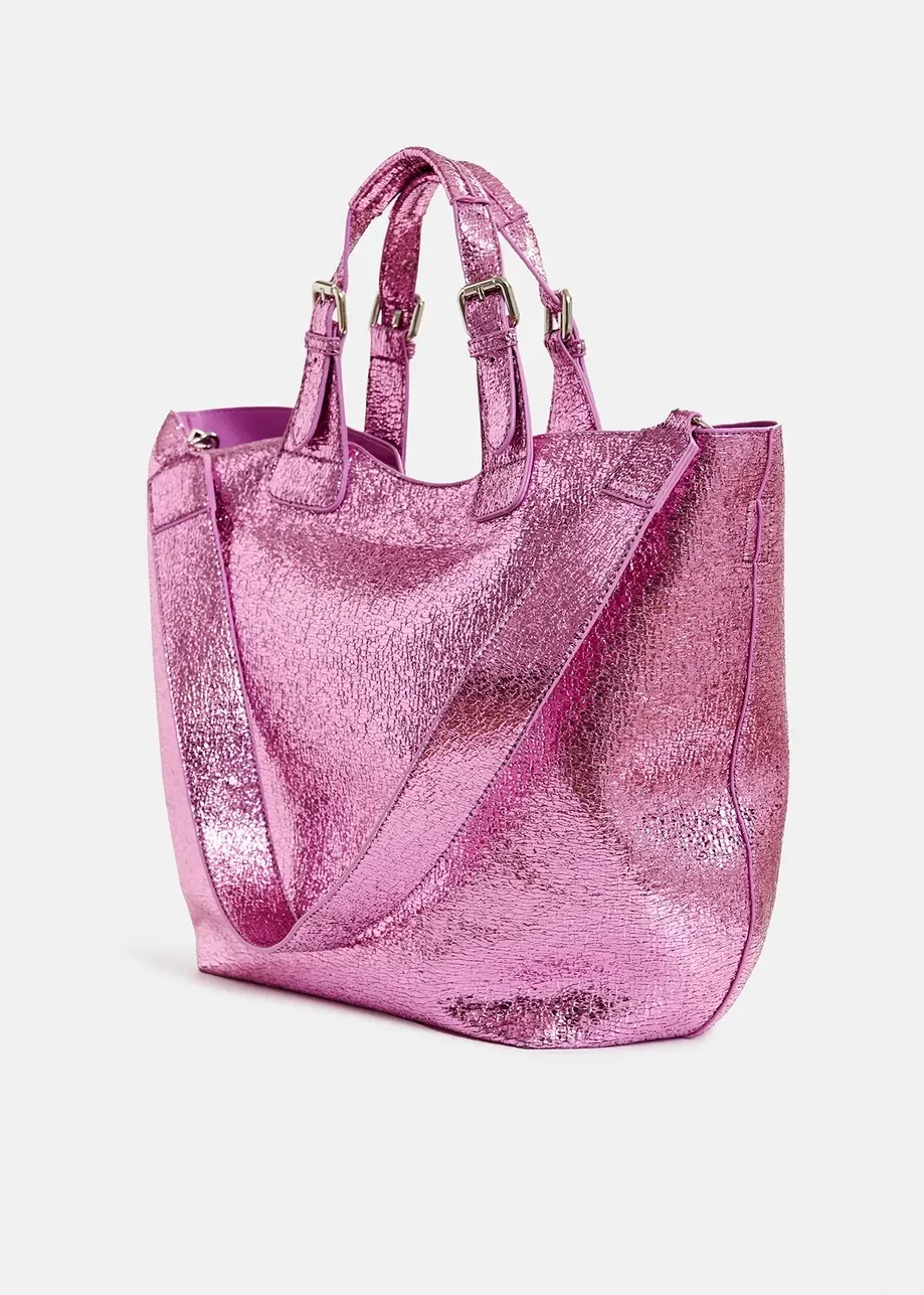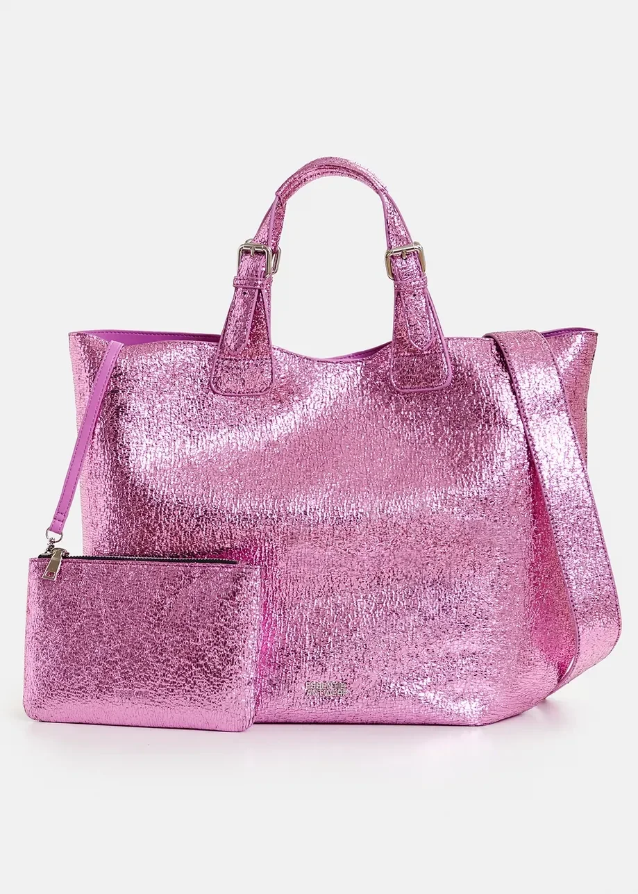 Shopper vervaardigd van glanzend faux leer met verkreukt effect. Met zijn ruime binnenkant en uitneembaar ritstasje voor kleinere objecten is hij een geweldige optie voor elke dag. Draag hem in de hand of op de schouder met de langere schouderriem.