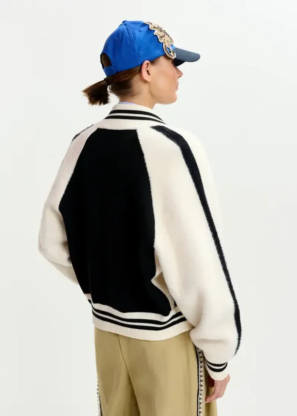 Bomberjack in fijn breiwerk voor een uiterst zacht gevoel, afgewerkt met inzetstukken in pluizig faux fur langs de mouwen en op de voorkant. Het heeft een relaxte pasvorm met raglanschouders voor extra beweeggemak en een opvallende ritssluiting vooraan. Gestreepte ribgebreide boorden zorgen voor een verzorgd silhouet.