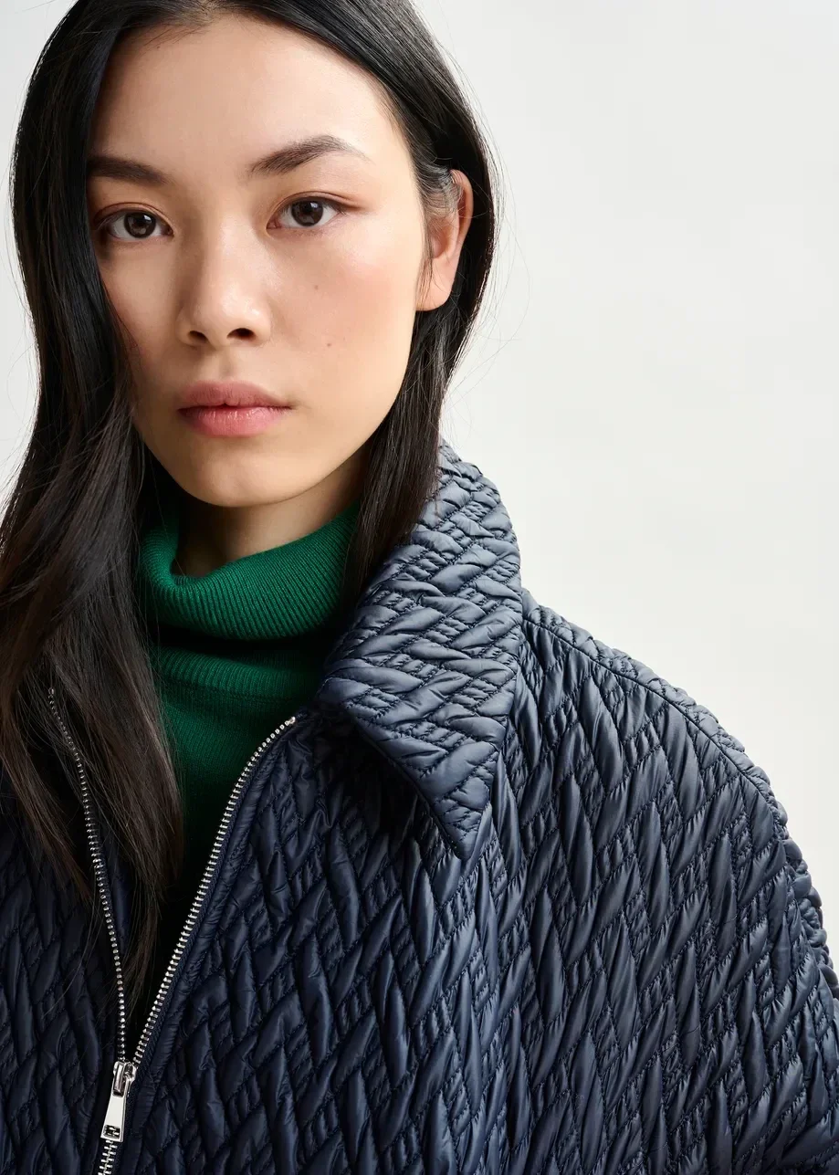 Bomberjack vervaardigd van soepel faux leer, delicaat afgewerkt met gevlochten stikwerk. Het is ontworpen in een relaxed silhouet met een iets kortere pasvorm. Het is voorzien van een ritssluiting, volumineuze mouwen met elastische uiteinden, een lage mouwinzet en een zachte voering voor meer comfort. Vooral de schuine steekzakken zijn handig om jouw telefoon en kaarthouder bij de hand te houden.