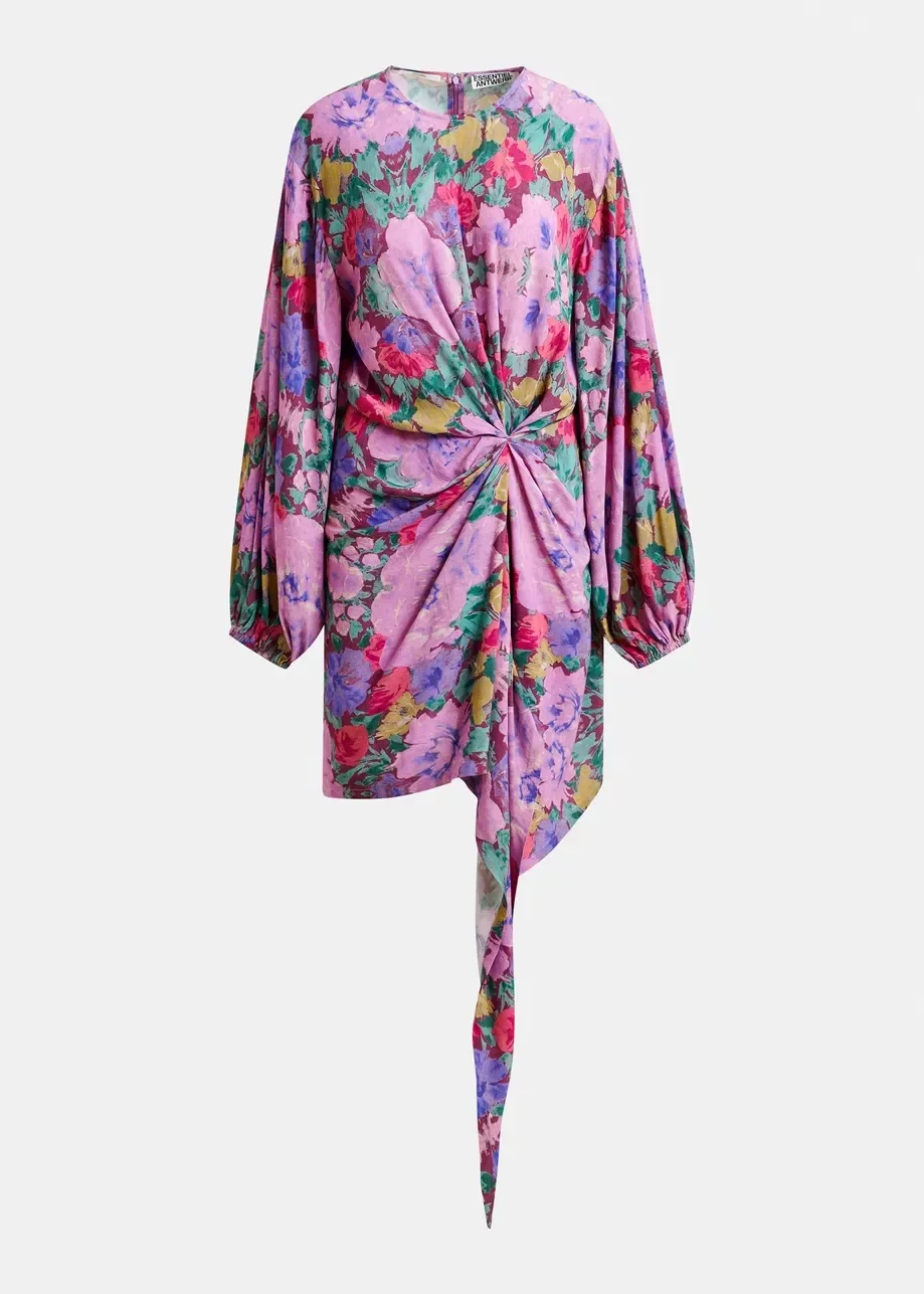 De mini-jurk heeft verlaagde schouders en ballonmouwen die zijn afgewerkt met elastische manchetten. De stof is bij de taille geplooid voor meer vorm, terwijl het asymmetrisch gedrapeerde rokgedeelte zorgt voor beweging en diepte. Een subtiele split zorgt voor draagcomfort, en verborgen ritssluitingen aan de achterkant en taille zorgen voor een nette afwerking. Gedeeltelijk gevoerd voor extra bedekking.