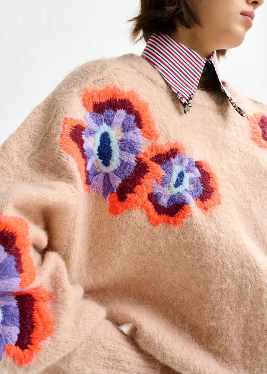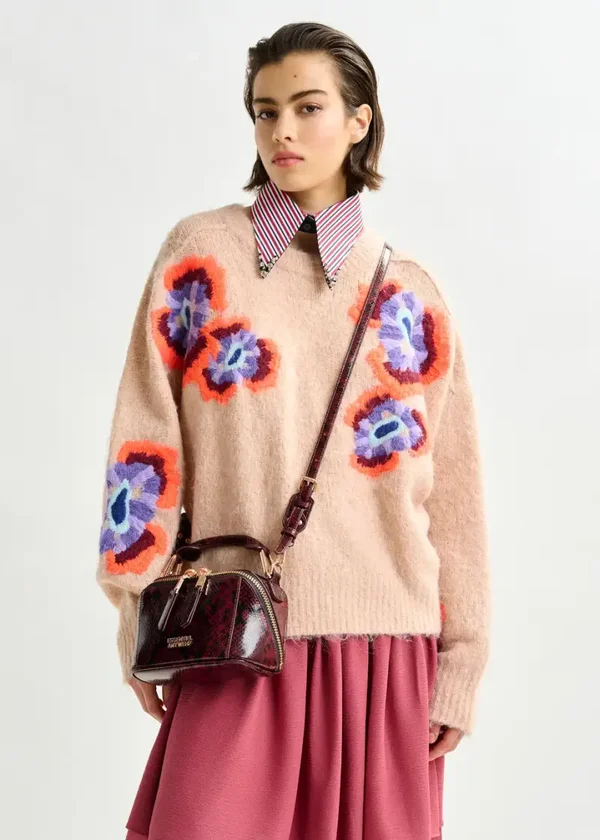 Deze jacquard gebreide trui is gesponnen van een geborstelde mohairmix en biedt een luxueus zachte textuur. Het relaxte silhouet heeft verlaagde schouders en geribbelde boorden, waardoor het de perfecte statement knit is voor moeiteloze laagjeslooks op koude dagen.