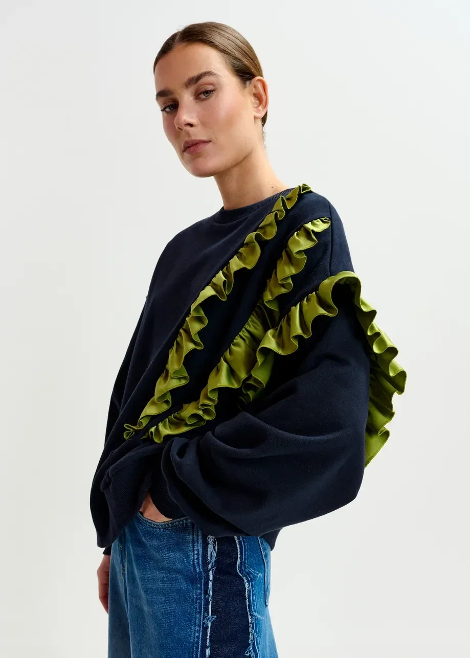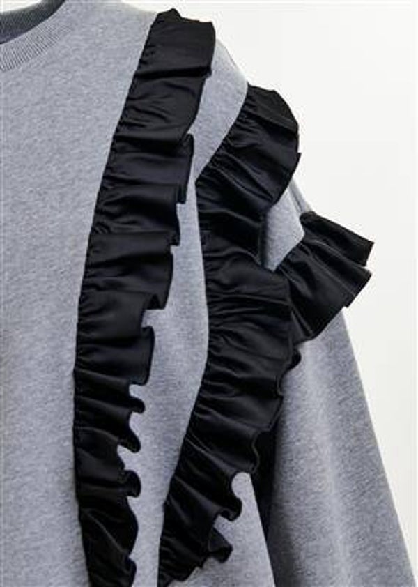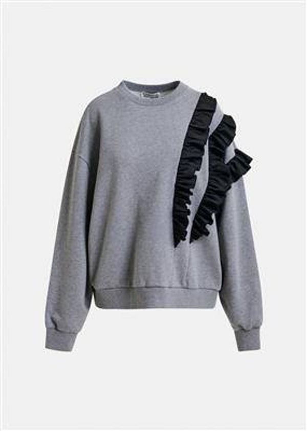 Sweater als elegante versie van het casual basisstuk. Hij is vervaardigd van een katoenmix stof in een relaxte pasvorm met lage mouwinzet voor een coole uitstraling. Opvallend is de asymmetrische volant over de voorkant en schouders, die het anders minimalistische ontwerp een textuurcontrast en vrouwelijk kantje geeft. De ribgebreide boorden, zoom en halslijn zorgen voor structuur en duurzaamheid, voor een even stijlvolle als praktische sweater voor de koudere dagen.