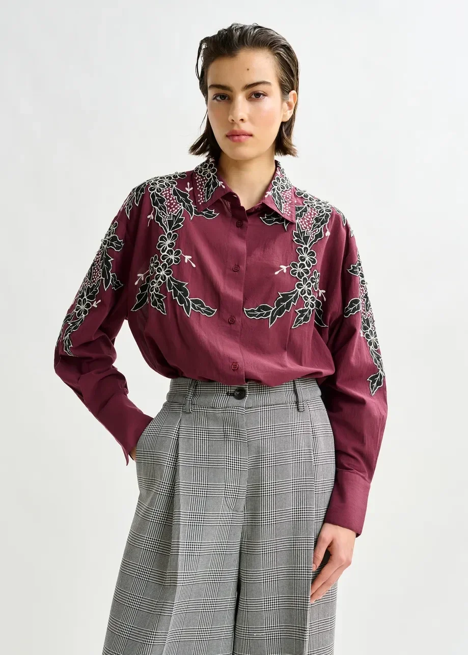 Overhemd vervaardigd van 100% katoen in een relaxte pasvorm met boxy silhouet en lage mouwinzet die de relaxte uitstraling versterken. Het is afgewerkt met geborduurde bloemen versierd met stras. De klassieke knoopsluiting is complementair met de afgeronde zoom met subtiele splits en langer achterpand. Ideaal om jouw dagelijkse look naar een hoger niveau te tillen met een twist.