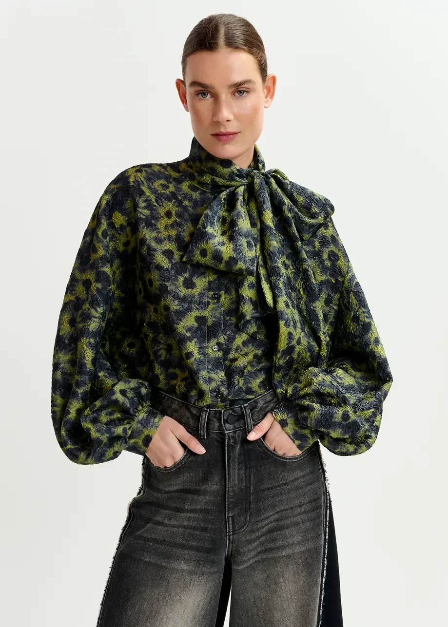 Oversized knoopjeshemd ontworpen met een veelzijdige strikkraag die je kan knopen tot een speelse strik of elegant kan laten draperen over de voorkant of rug. Het statement overhemd met jacquard bloemenprint is voorzien van een lage mouwinzet, volumineuze mouwen en een afgeronde zoom voor een relaxed maar verfijnd silhouet.