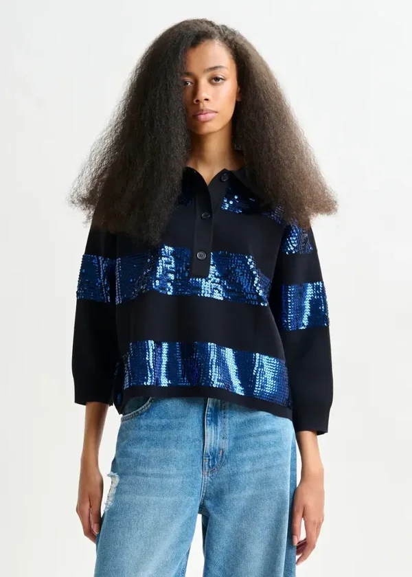 Fijngebreide polo die een sportief model combineert met opvallende sprankels. Hij is ontworpen in een relaxte pasvorm en versierd met strepen van pailletten op de borst en mouwen, met een contrasterende kraag en een knooppasje. De lager ingezette 3/4-mouwen en subtiel afgeronde zoom maken het silhouet extra comfortabel, terwijl de geribbelde boorden zorgen voor een stijlvolle uitstraling.