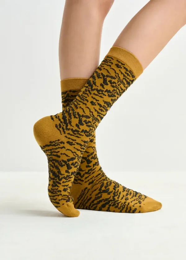 Sokken gebreid in tijgerjacquard, afgewerkt met ribgebreide boorden om comfortabel te blijven zitten.