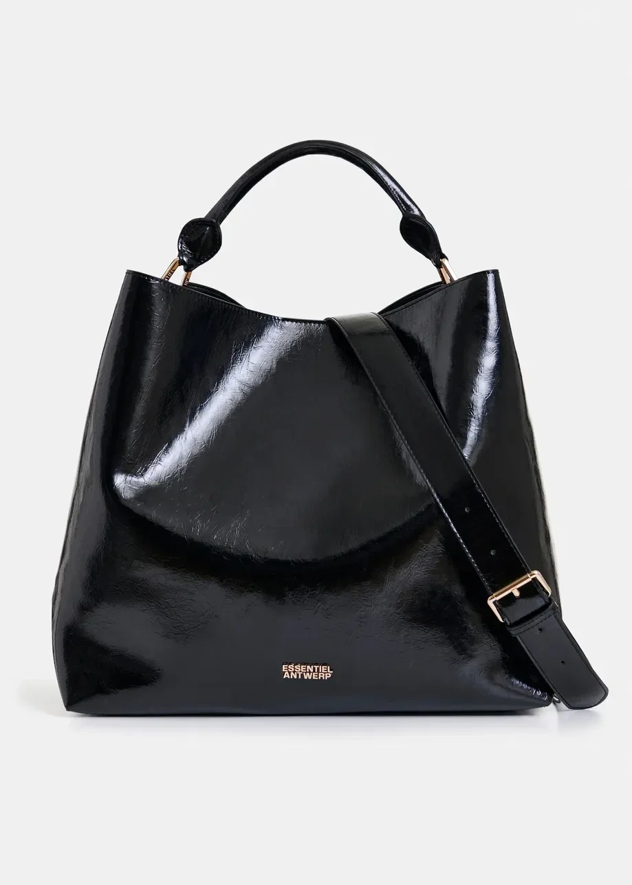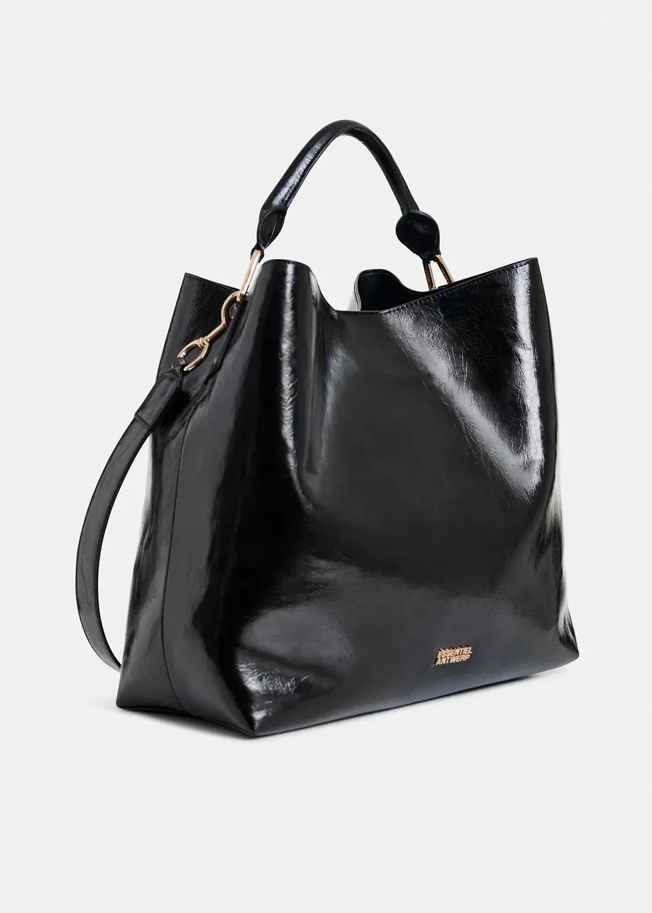 Shopper vervaardigd van glanzend faux leer in een losse, rechthoekige vorm, afgewerkt met een comfortabel handvat bovenaan voor een chique draagoptie in de hand. Hij is ook voorzien van een verwijdere schouderriem om hem handsvrij te dragen. De gevoerde binnenkant is voorzien van een ritsvak en een kaartenvak voor kleine essentials.