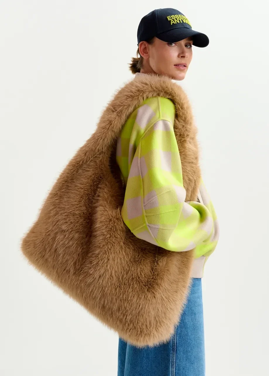 Oversized schoudertas vervaardigd van ultrazacht faux fur met een luxueuze, tactiele afwerking en een wijd handvat in dezelfde stof voor een coherente look. De binnenkant is gevoerd met zacht suède voor extra structuur en comfort, afgewerkt met een magneetsluiting voor meer gebruiksgemak. Kortom, dit pluchen statement accessoire is ontworpen om jouw dagelijkse verplaatsingen een dosis textuur en warmte te geven.
