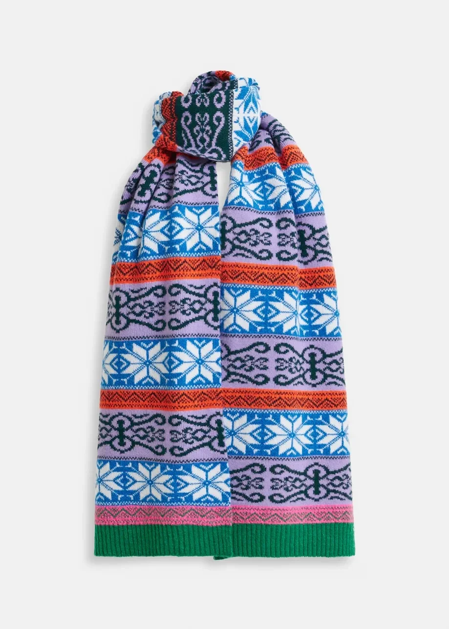 Wikkel jezelf in kleur en comfort met deze sjaal in gebreid jacquard, versierd met een opvallend kleurrijk motief en verfijnde afwerkingsdetails. Zijn afmetingen van 230 x 38,5 cm bieden je voldoende dekking op frisse dagen, zonder je een zwaar gevoel te geven. De ribgebreide boorden zorgen voor een geraffineerde uitstraling, perfect om jouw outfit af te maken.