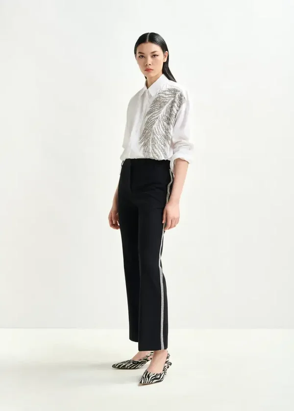 Overhemd vervaardigd van 100% katoen in een oversized pasvorm met lage mouwinzet en afgeronde zoom met langer achterpand. Het is voorzien van een knoopsluiting over de hele lengte en van een klassieke puntkraag. Het sierlijke verenmotief op de borst en schouder, geborduurd van pailletten, strass en kralen, zorgt voor een extra dimensie.