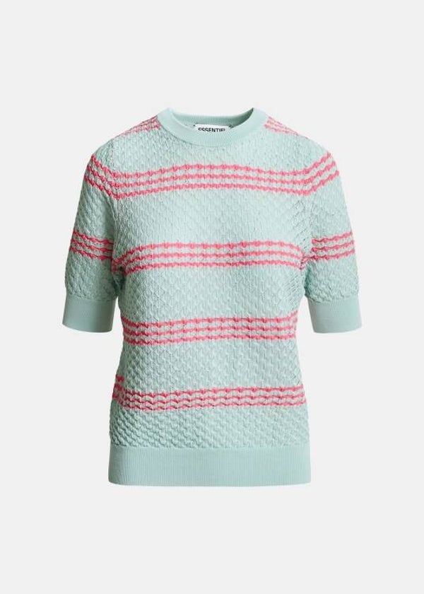 Polo met korte mouwen vervaardigd van een lichtgewicht mix met gerecyclede polyester in een verfijnde honingraatstructuur die zorgt voor textuur en luchtigheid. Afwisselende ton-sur-ton strepen geven de stof een dimensionaal effect. De polo heeft een relaxte pasvorm met geribbelde zoom en manchetten, en is elegant afgewerkt met een verwijderbare katoenen kraag. De puntkraag is versierd met delicate stras en sluit netjes aan de achterkant met een kleine knoopsluiting, waardoor veelzijdige stylingopties mogelijk zijn.